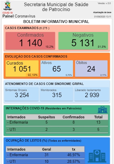 A Secretaria Municipal de Saúde de Patrocínio divulgou, em novo formato, o boletim epidemiológico de coronavírus nesta terça-feira (01).