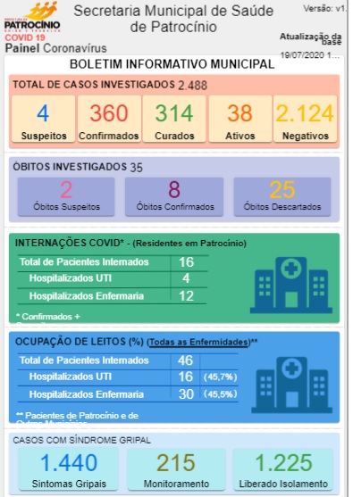 Neste domingo (19), a Secretaria Municipal de Saúde de Patrocínio divulgou o novo boletim epidemiológico de coronavírus.