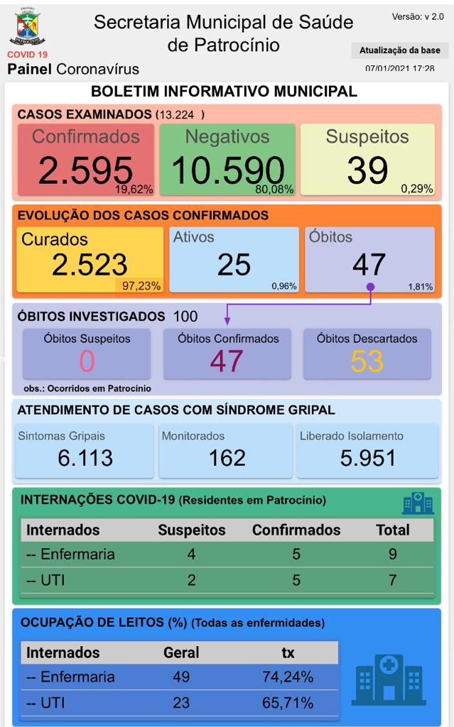O novo boletim epidemiológico de coronavírus foi divulgado pela Secretaria Municipal de Saúde de Patrocínio na tarde desta quinta-feira (07).