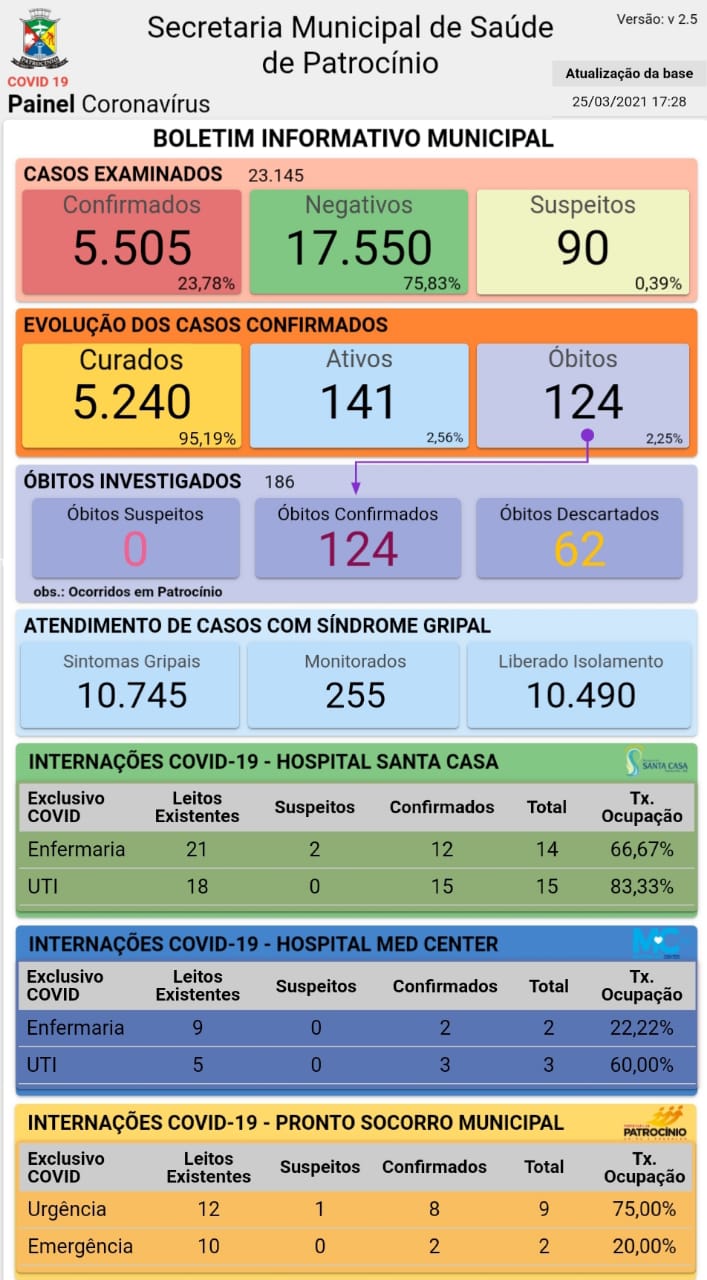 A Secretaria Municipal de Saúde de Patrocínio divulgou nesta quinta-feira (25) o novo boletim epidemiológico de coronavírus.