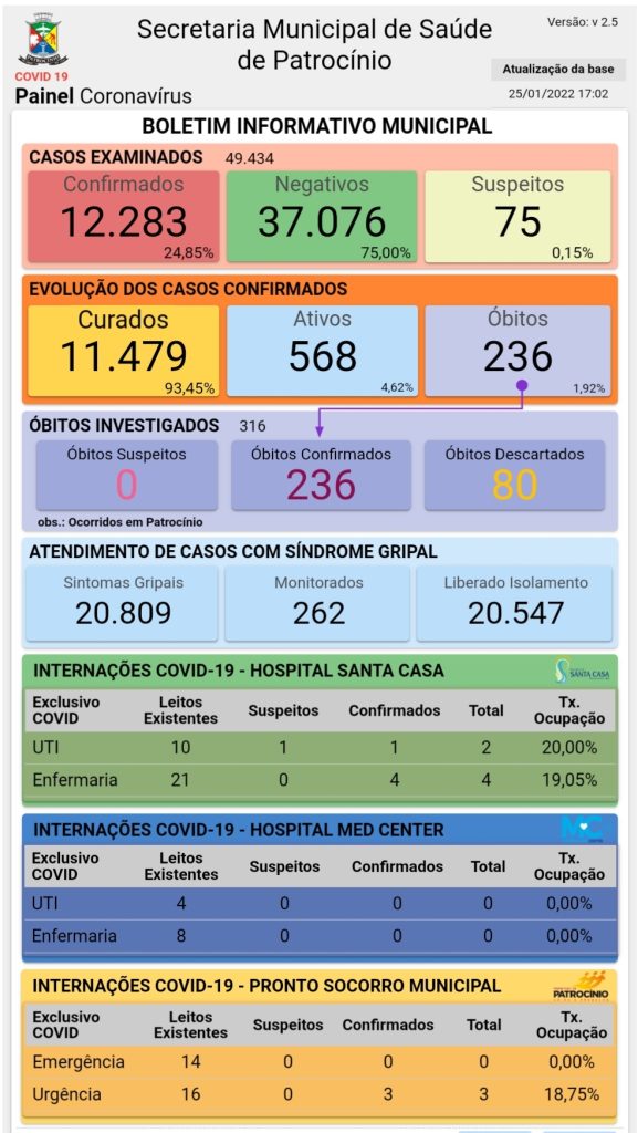 Nesta terça-feira (25) a Secretaria Municipal de Saúde de Patrocínio divulgou o novo boletim epidemiológico de coronavírus.