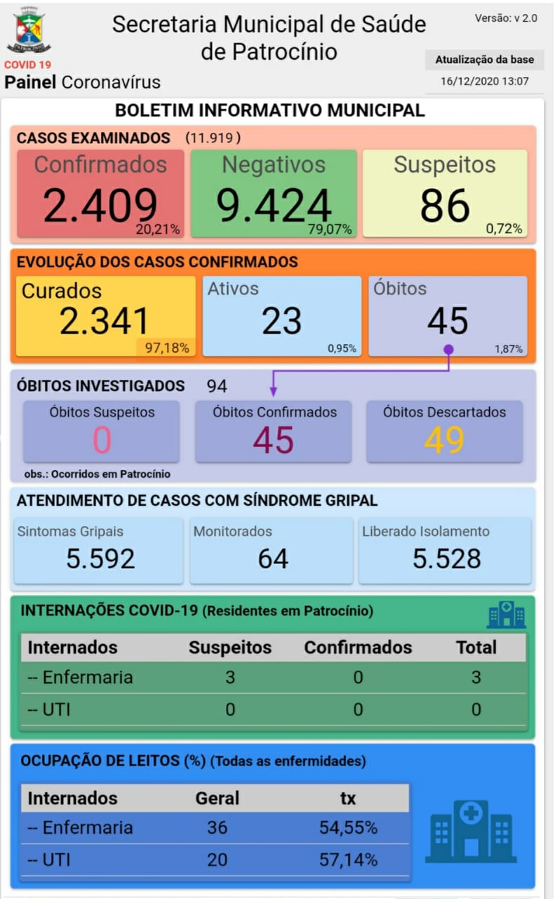 A Secretaria Municipal de Saúde de Patrocínio divulgou, na tarde desta quarta-feira (16), o novo boletim epidemiológico de coronavírus.