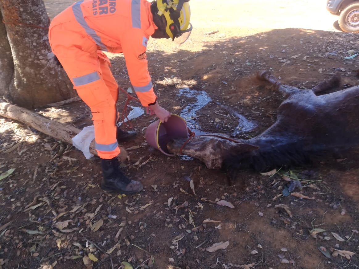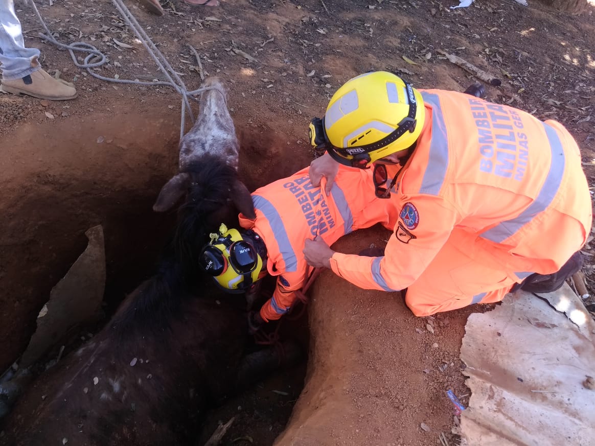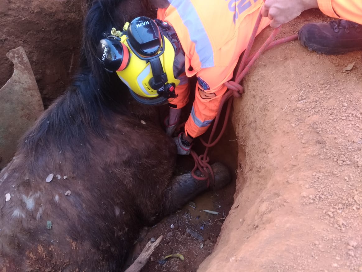 Equipe do Corpo de Bombeiros resgata cavalo que caiu em uma fossa na Fazenda Serra Negra