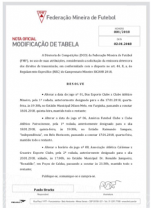 Nesta terça-feira, 02, por volta de 11h31, a Federação Mineira de Futebol (FMF), através de seu Twitter, anunciou alterações na tabela do Campeonato Mineiro da primeira divisão. Após as mudanças, a estreia do Clube Atlético Patrocinense inicialmente marcada para o dia 18/01, contra o América, no Independência, agora será dia 17/01, ás 19h30. Já a partida entre Boa Esporte e Atlético-MG, de quarta-feira foi transferida para a quinta. Outra mudança feita foi no duelo válido pela segundo rodada entre Cruzeiro e Caldense, que será às 21h30 de sábado, 20.