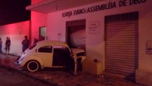 Um motorista foi socorrido pelo Corpo de Bombeiros, após colidir contra a porta de uma igreja, na rua Francisco Ramos, bairro Boa Esperança. O Fusca ficou com a dianteira bastante danificada, bem como a porta do templo e parte da parede. O motorista teve que ser retirado pela porta do passageiro. Ele apresentava cortes no rosto e no queixo.