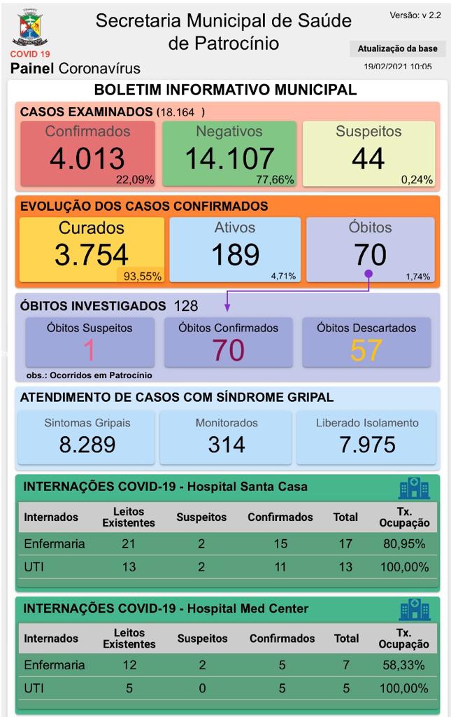 O novo boletim epidemiológico de coronavírus foi divulgado pela Secretaria Municipal de Saúde de Patrocínio na manhã desta sexta-feira (19).