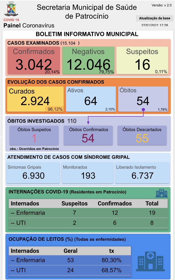 O novo boletim epidemiológico de coronavírus foi divulgado pela Secretaria Municipal de Saúde de Patrocínio na tarde desta quarta-feira (27).