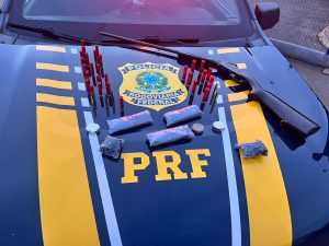 Ao fiscalizar os itens obrigatórios e também identificar possíveis motos no bagageiro, policiais perceberam que uma das bagagens estava entreaberta, durante fiscalização policiais localizaram uma espingarda que estava enrolada em um pano.
