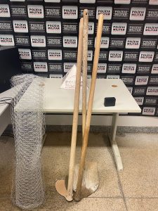 O autor entrou na obra de construção e furtou uma enxada e duas pá além de uma tela de proteção. Apos ser acionados, os militares conseguiram localizar o autor já em fuga a pé de posse dos bens que foram furtados.