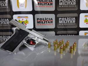 Durante a conferência dos documentos do veículo e do condutor militares constaram que o condutor estava de posse de uma arma de fogo na cintura se tratava de uma pistola marca taurus calibre .380 e mais 13 munições .