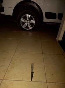 Os militares fizeram varredura e ninguém foi localizado, porém o veículo VW Saveiro Cross, que estava na garagem estava com três pneus furados por um objeto perfurante, sendo localizado ao lado do veículo a faca utilizada na ação.