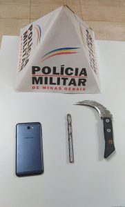 Os militares localizaram e prenderam o autor, recuperaram celular furtado e apreenderam a faca.