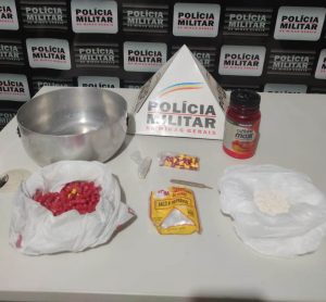 Durante buscas, foram localizados os entorpecentes abaixo descritos, no exato momento em que o autor preparava a droga.