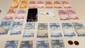 Na busca pessoal, os policiais encontraram R$ 138,25 em notas trocadas no bolso do suspeito. No local onde ele havia dispensado o objeto, foi localizado um invólucro plástico contendo uma pedra de crack que, segundo a PM, poderia render cerca de dez porções da droga para comercialização.