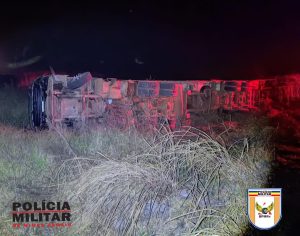 Acionados pela sala de operações, militares da Polícia Militar Rodoviária Estadual, chegaram ao local e visualizaram uma carreta carregada com farelo de soja tombada as margens da rodovia.