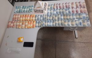 Já na residência de onde autor saiu militares localizaram RS 624,00 totalizando em R$ 1.314,00, além de saquinhos plásticos que seriam utilizados para embalar drogas e uma pedra pequena semelhante ao crack. Ainda durante buscas pelo local, militares localizaram um aparelho de celular que também foi apreendido pelos militares.