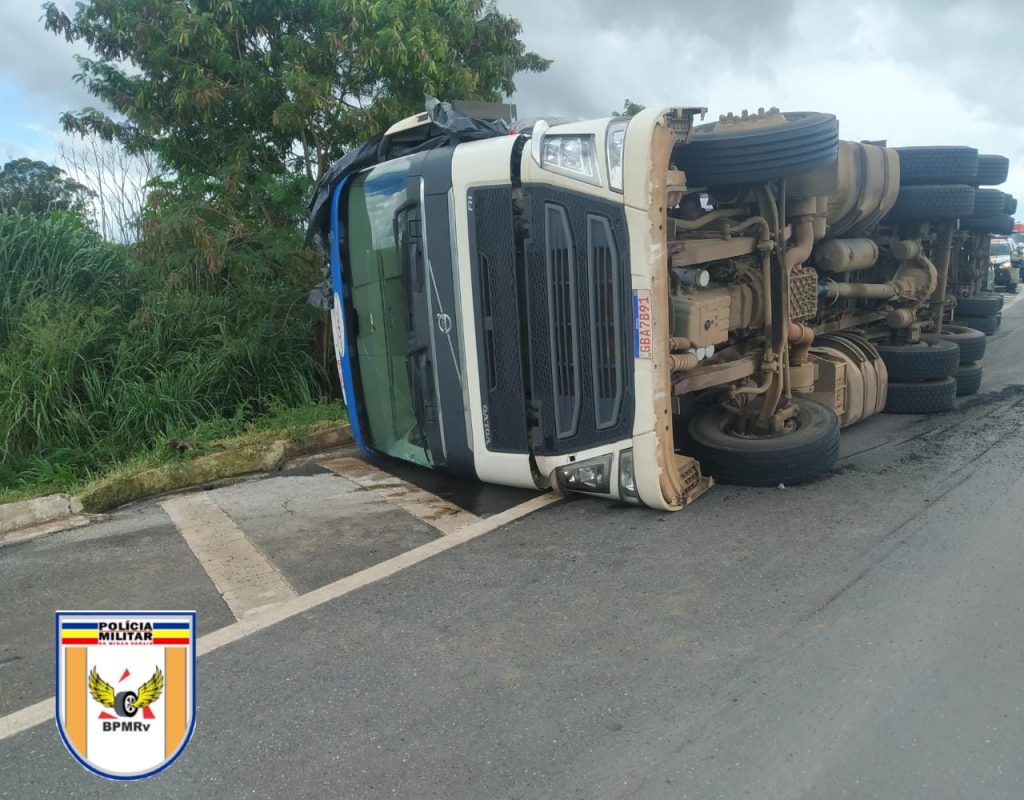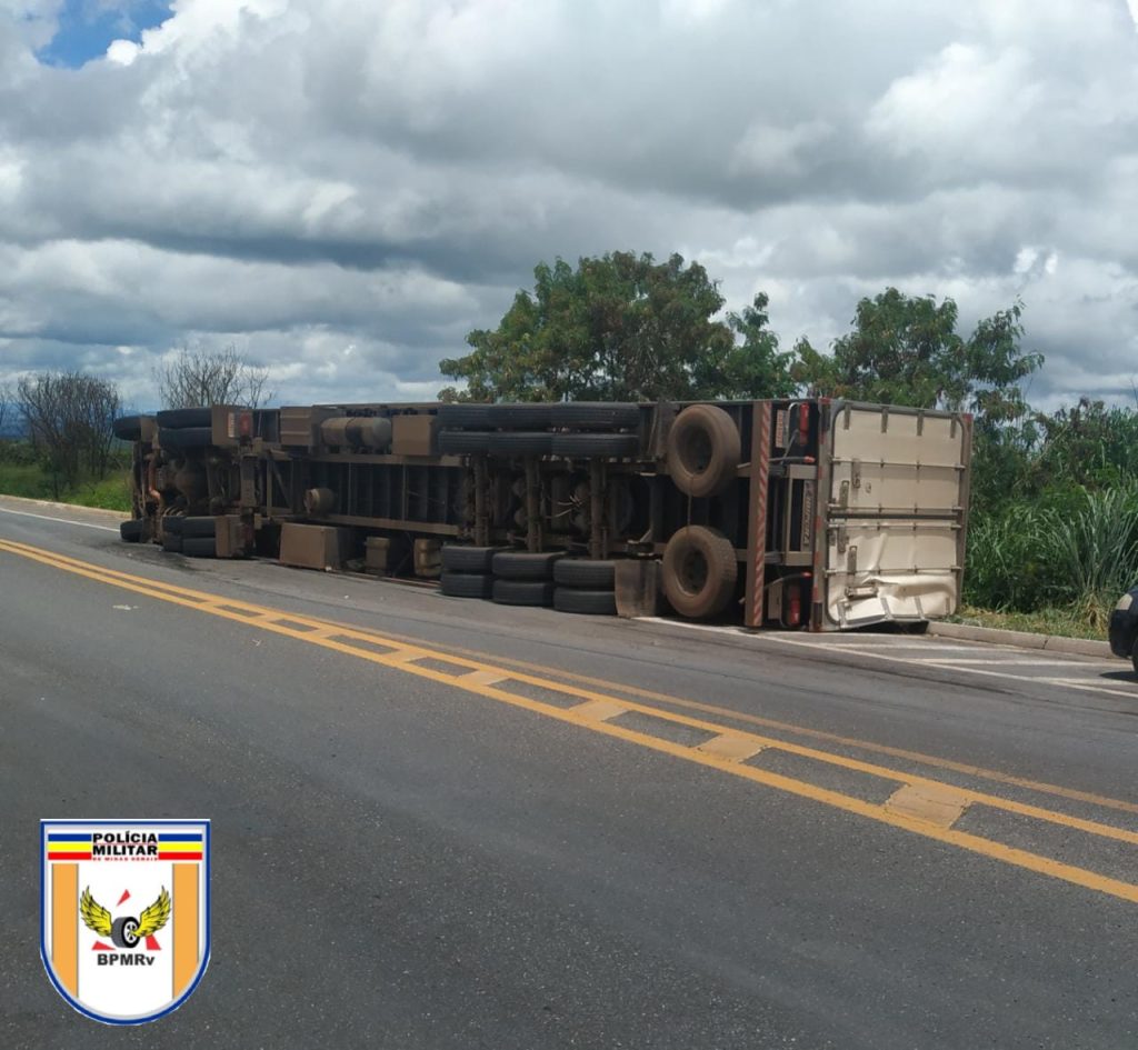 Ao chegar ao local militares constaram no local, que havia um conjunto veicular, Caminhão/Trator Volvo e um semi-reboque ambos tombados ocupando o acostamento e parte da pista de rolamento.