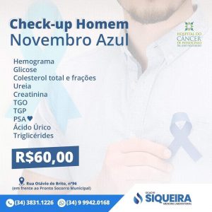 Segundo Andréia, uma das ações realizadas no Outubro Rosa foi oferecer, em parceria com o Laboratório Siqueira, um pacote de exames com o valor de R$60,00. Assim, no mês de novembro, esse pacote ainda será oferecido e terá o adicional para os homens do PSA, que pode indicar o câncer de próstata.