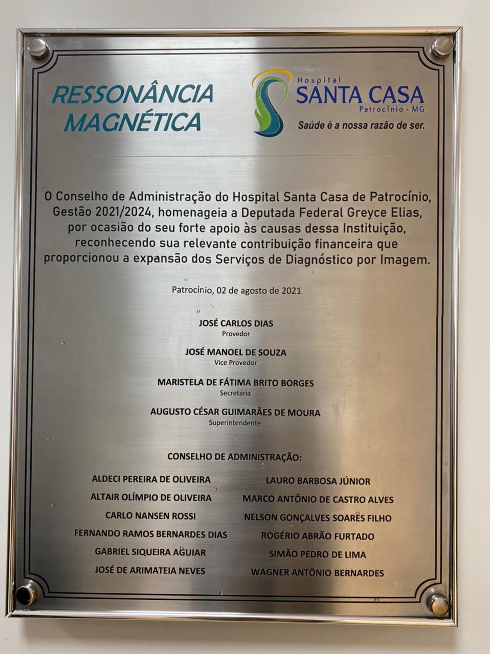 A construção do espaço e instalação da máquina importada da Alemanha teve custeio total de cerca de R$5 milhões. A maior parte deste valor, foi adquirido através de uma emenda parlamentar de responsabilidade da Deputada Federal patrocinense, Greyce Elias. “É muito importante a gente fortalecer, cada vez mais, o trabalho da Santa Casa. Essa emenda parlamentar, no valor de R$3.480.000,00, veio exatamente para a gente oferecer para os nossos cidadãos a oportunidade de ter esse exame de ressonância magnética, agora também pelo SUS […] A gente tem um sistema de saúde, que hoje, é reconhecido internacionalmente, tem várias coisas que precisamos aperfeiçoar, como tudo na vida, mas é importante que a gente entenda que o nosso projeto de saúde pública, hoje, é um sistema que, se executado da forma correta, é um serviço de excelência”, afirmou Greyce.