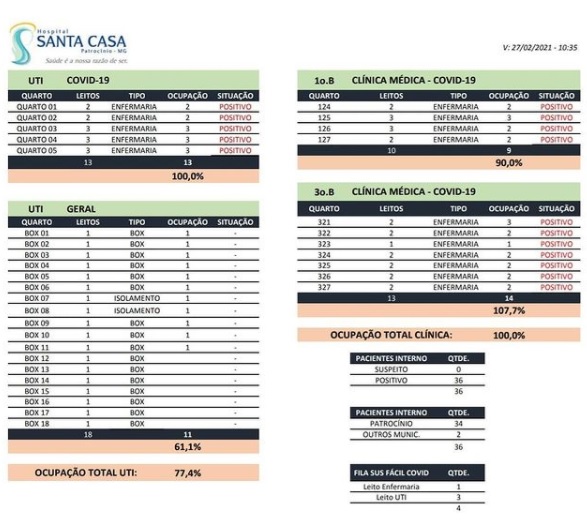 O Hospital Santa Casa de Patrocínio divulgou neste sábado (27) um boletim com informações detalhadas referente à ocupação hospitar da entidade.
