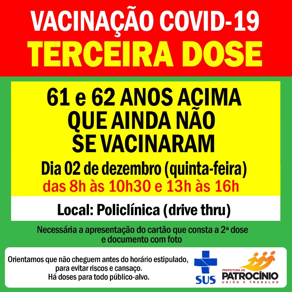 Nesta quinta-feira (02) idosos de 61 e 62 acima que ainda não tomaram a terceira dose da vacina contra Covid-19 terão mais uma oportunidade.