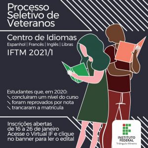 Os alunos do CENID (Centro de Idiomas) do IFTM Patrocínio que, em 2020, concluíram um nível do curso, foram reprovados por nota ou trancaram a matrícula, tem de 16 a 26 de janeiro para fazer a inscrição no Processo Seletivo de Veteranos.
