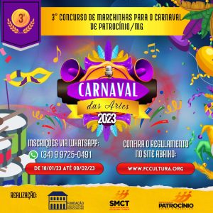 A Secretaria Municipal de Cultura e Turismo segue realizando as inscrições para o terceiro Concurso de Marchinhas do carnaval 2023 de Patrocínio.