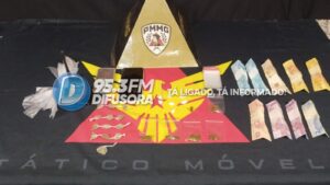Já em uma prateleira na varanda, foram encontrados 13 buchas de substância semelhante à maconha, cinco pacotes de uma variação da droga conhecida como “flor”, sete papelotes de substância semelhante à cocaína, além de um aparelho celular.