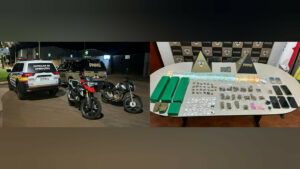 Com o avanço das investigações, a Polícia Militar localizou um suspeito no bairro Vila Dourada, onde foi encontrada uma motocicleta de luxo furtada na cidade de Uberlândia. Além de drogas, dinheiro em espécie, balança de precisão e materiais utilizados para embalo de entorpecentes.