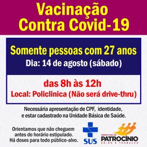 Ao contrário das outras etapas de vacinação contra Covid-19 em que não ocorriam aos sábados, nesta semana será diferente. Amanhã (14) pessoas com 27 anos serão vacinadas, dando sequência a imunização por idade em Patrocínio.