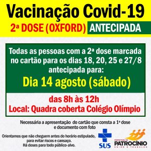 Simultaneamente na Quadra coberta do Colégio Olímpio, das 8h às 12h, todas as pessoas que tem a 2ª dose da Astrazeneca marcada no cartão para os dias 18, 20, 25 e 27 de agosto receberão a vacina neste sábado (14). Nesta situação é necessária a apresentação de documento com foto e apresentação do cartão que consta a 1ª dose.