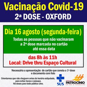 Já na segunda-feira (16) serão aplicadas somente 2ª dose da Astrazeneca para todas aquelas pessoas que constam no cartão até esta data e ainda não receberam a dose da vacina. A imunização será realizada das 8h às 11h, no Espaço Cultural, em formato drive thru. Assim como é de praxe deve ser apresentado documento com foto e apresentação do cartão que confirma a 1ª dose.