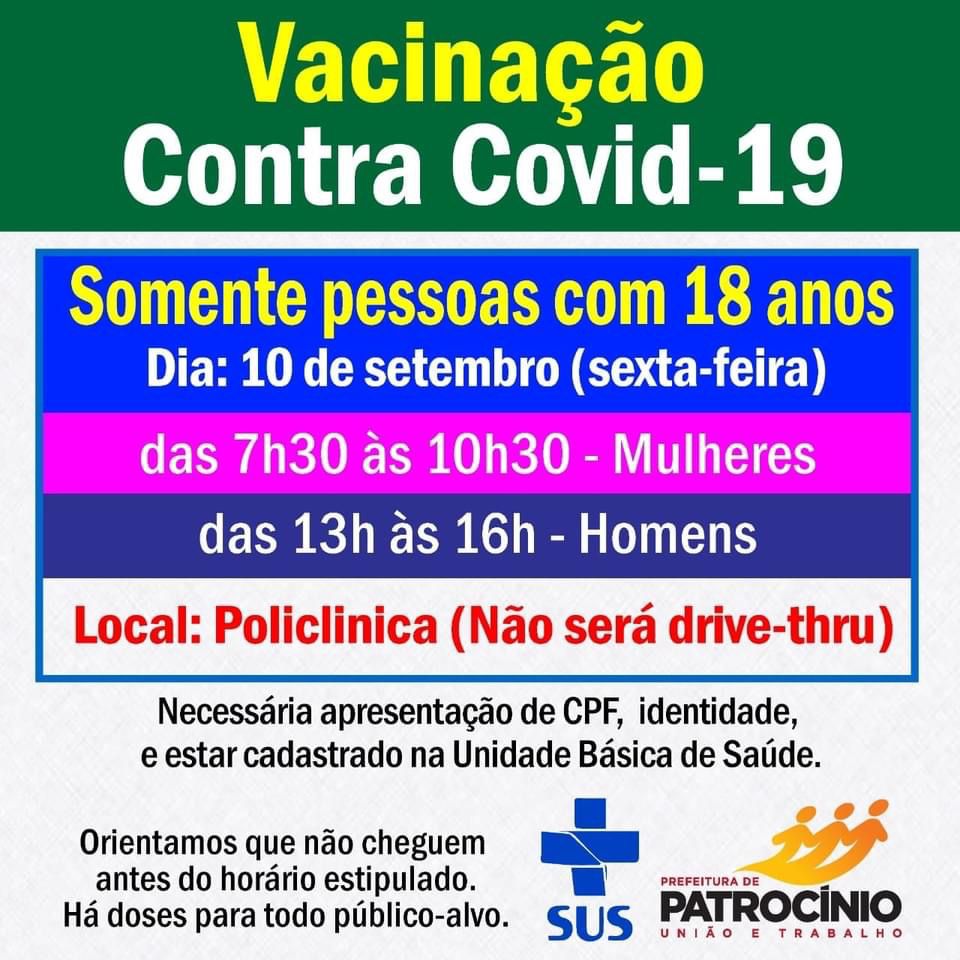 Jovens de 18 anos serão vacinados contra COVID-19, nesta sexta-feira, 10, em Patrocínio