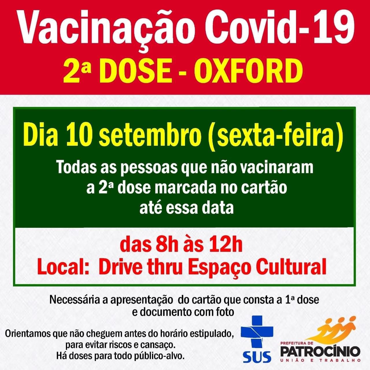 A 2ª dose da Astrazeneca será aplicada no Espaço Cultural pelo método drive-thru, das 8h às 12h. É necessário apresentar o cartão de vacina, onde consta a 1ª dose e um documento que tenha foto.