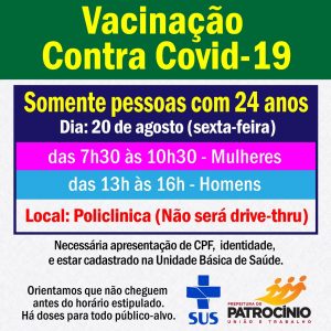 Nesta sexta-feira (20) Patrocínio avança mais uma etapa de vacinação por idade, desta vez a faixa etária é de pessoas com 24 anos.
