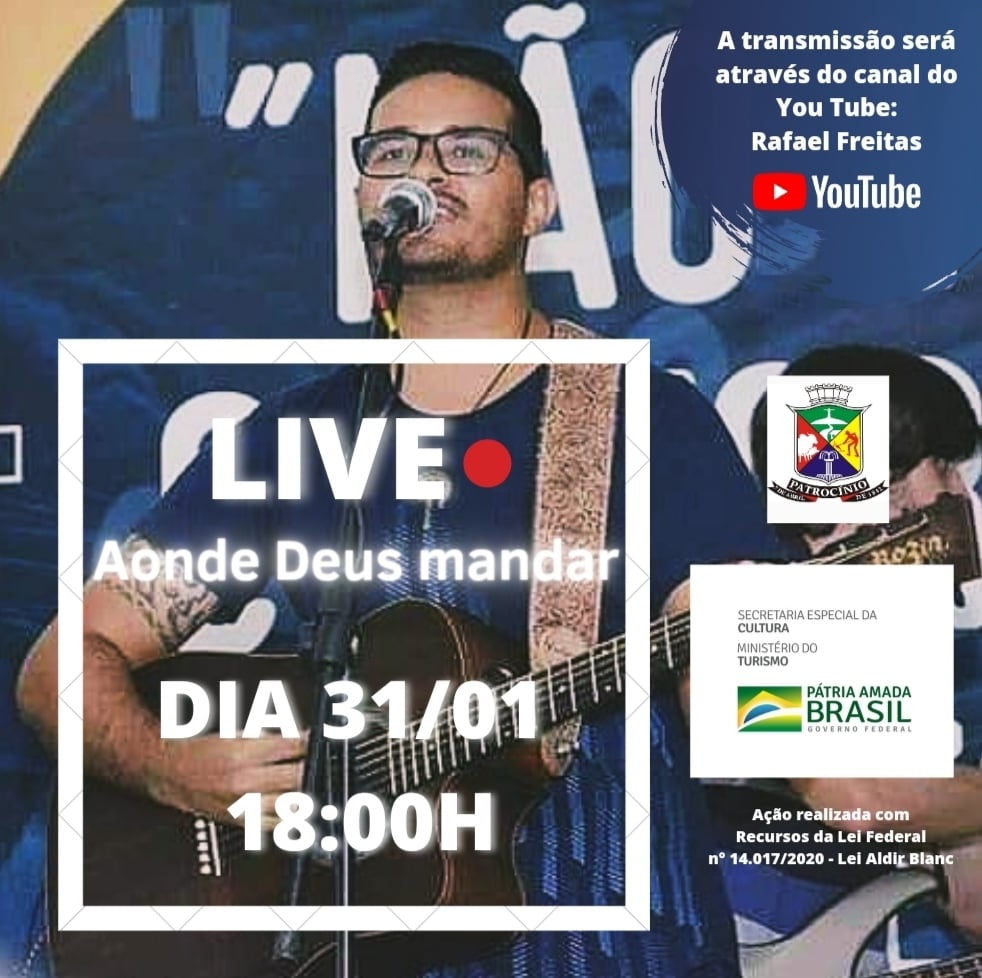 Ainda no domingo, a partir das 18h haverá a Live religiosa “Aonde Deus mandar”, na qual Rafael Freitas e banda apresentarão músicas motivacionais de fé e esperança com mensagens da palavra de Deus. Será transmitida, ao vivo, através do canal do youtube Rafael Freitas.