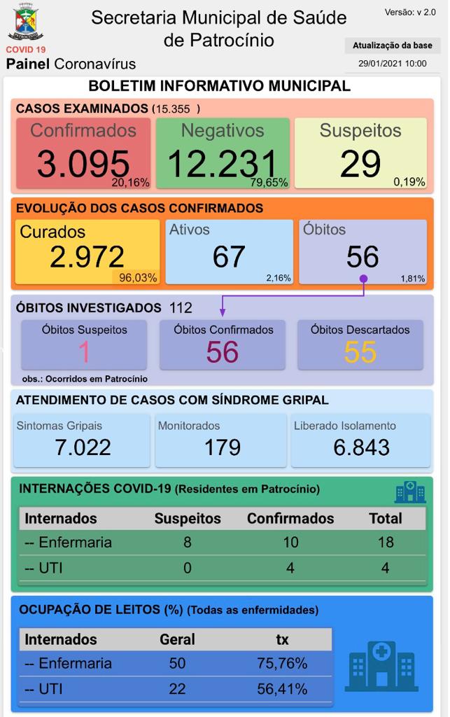 O novo boletim epidemiológico de coronavírus foi divulgado pela Secretaria Municipal de Saúde de Patrocínio na tarde desta sexta-feira (29).