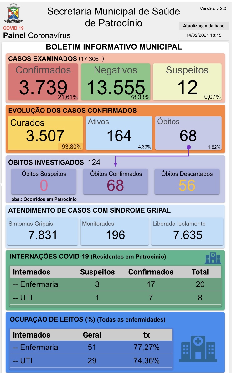O novo boletim epidemiológico de coronavírus foi divulgado, na noite deste domingo (14), pela Secretaria Municipal de Saúde de Patrocínio.