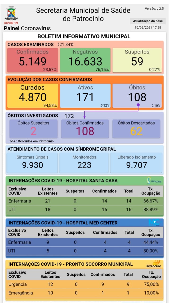 Foi divulgado nesta terça-feira (16), pela Secretaria Municipal de Saúde de Patrocínio, o novo boletim epidemiológico de coronavírus no município.