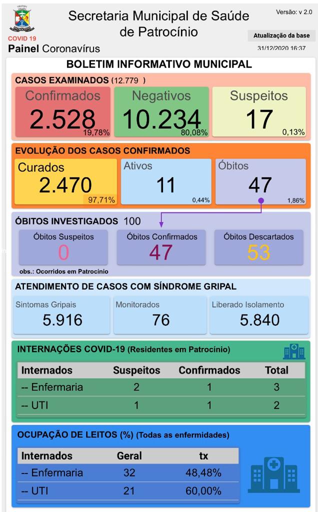 A Secretaria Municipal de Saúde de Patrocínio divulgou, na tarde desta quinta-feira (31), o novo boletim epidemiológico de coronavírus.
