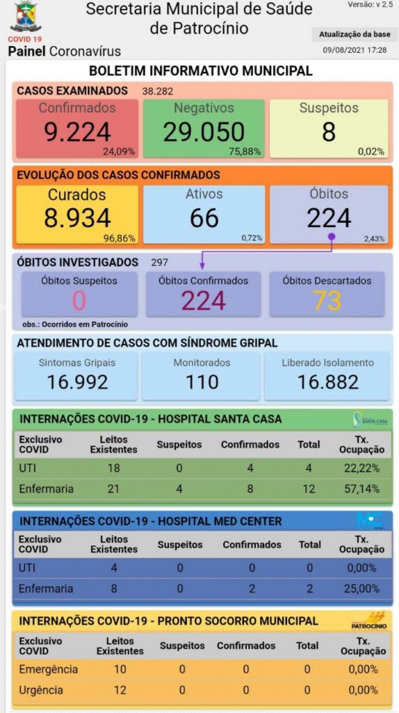 Foi divulgado nesta segunda-feira (09) pela Secretaria Municipal de Saúde de Patrocínio o novo boletim epidemiológico de coronavírus.