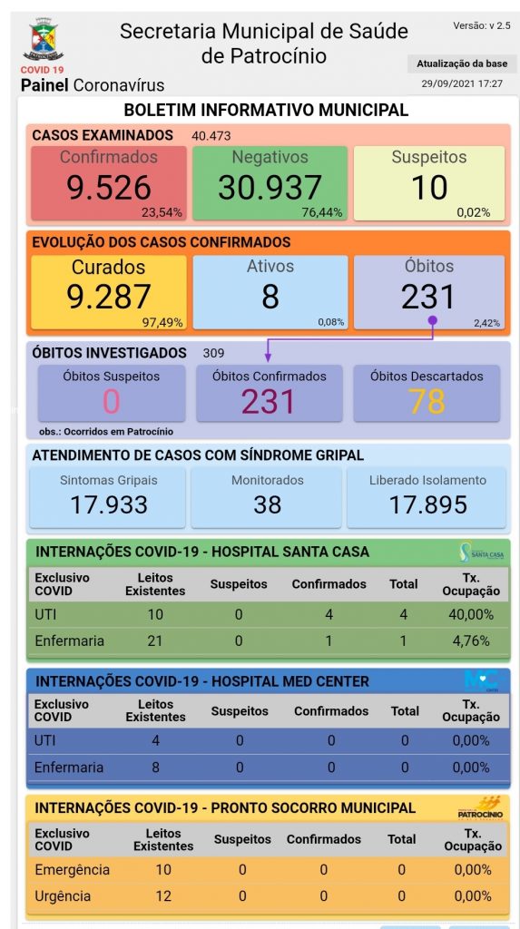 A Secretaria Municipal de Saúde de Patrocínio divulgou nesta quarta-feira (29) o novo boletim epidemiológico de coronavírus.