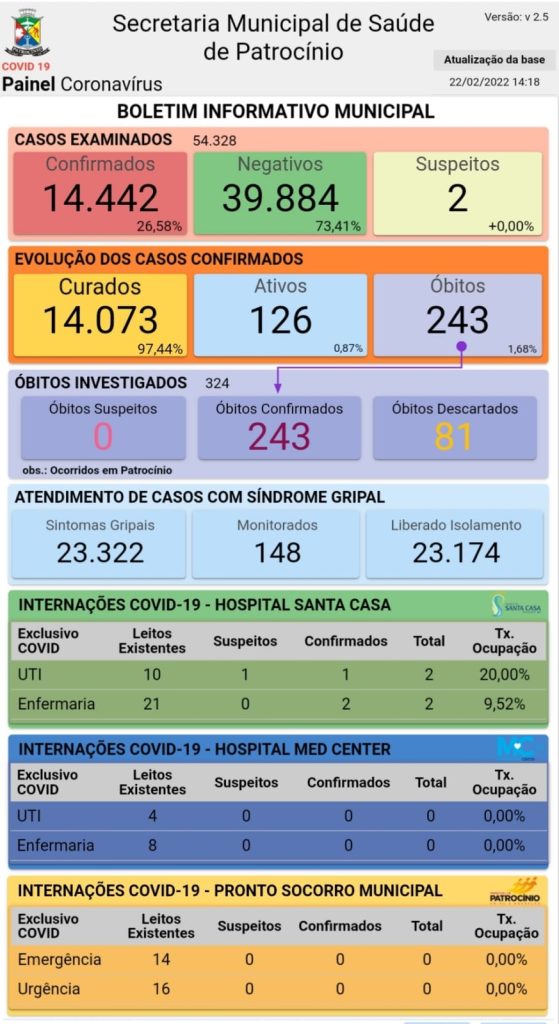 A Secretaria Municipal de Saúde de Patrocínio divulgou nesta terça-feira (22) o novo boletim epidemiológico de coronavírus.