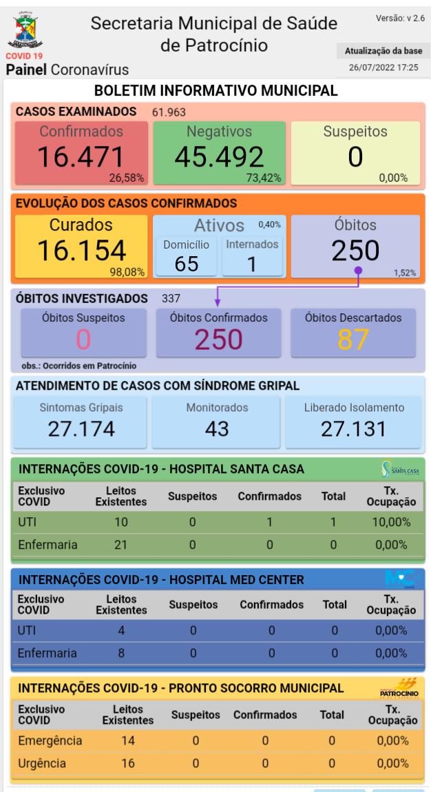 Nesta terça-feira (26), a Secretaria Municipal de Saúde de Patrocínio divulgou o novo boletim epidemiológico de Coronavírus.
