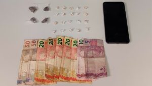 Durante as buscas nas mediações foram localizados o restante dos materiais sendo, quatro buchas de maconha, 20 pedras de crack, um telefone celular e a quantia de R$215,00 (duzentos e quinze reais).