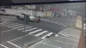 Uma caminhonete Fiat Toro de cor branca seguia pela Rua Martins Mundim e não respeitou o sinal de parada obrigátoria, vindo a atingir uma jovem de 18 anos de idade, que estava em motocicleta trafegando pela Rua Presidente Vargas sentido ao bairro São Francisco.