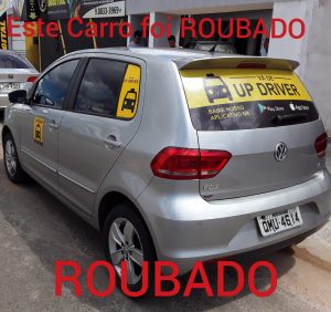 O veículo é um VW/Fox, de cor prata, com placa QMU-4614, emplacado em Patrocinio, e com adesivos da empresa UP Driver.