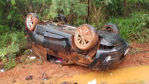 Com a pista molhada, o condutor do veículo, que seguia de Uberlândia sentido a Patrocínio, perdeu o controle de direção ao fazer a curva, vindo a capotar o veículo.