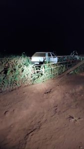 Ao transitar pela estrada vicinal o condutor perdeu o controle direcional do veículo danificando a cerca de proteção do local e invadindo uma plantação de milho existente as margens da estrada.