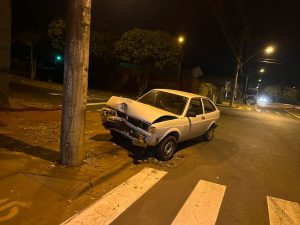 Mulher perde o controle de veículo e colide contra poste de iluminação pública